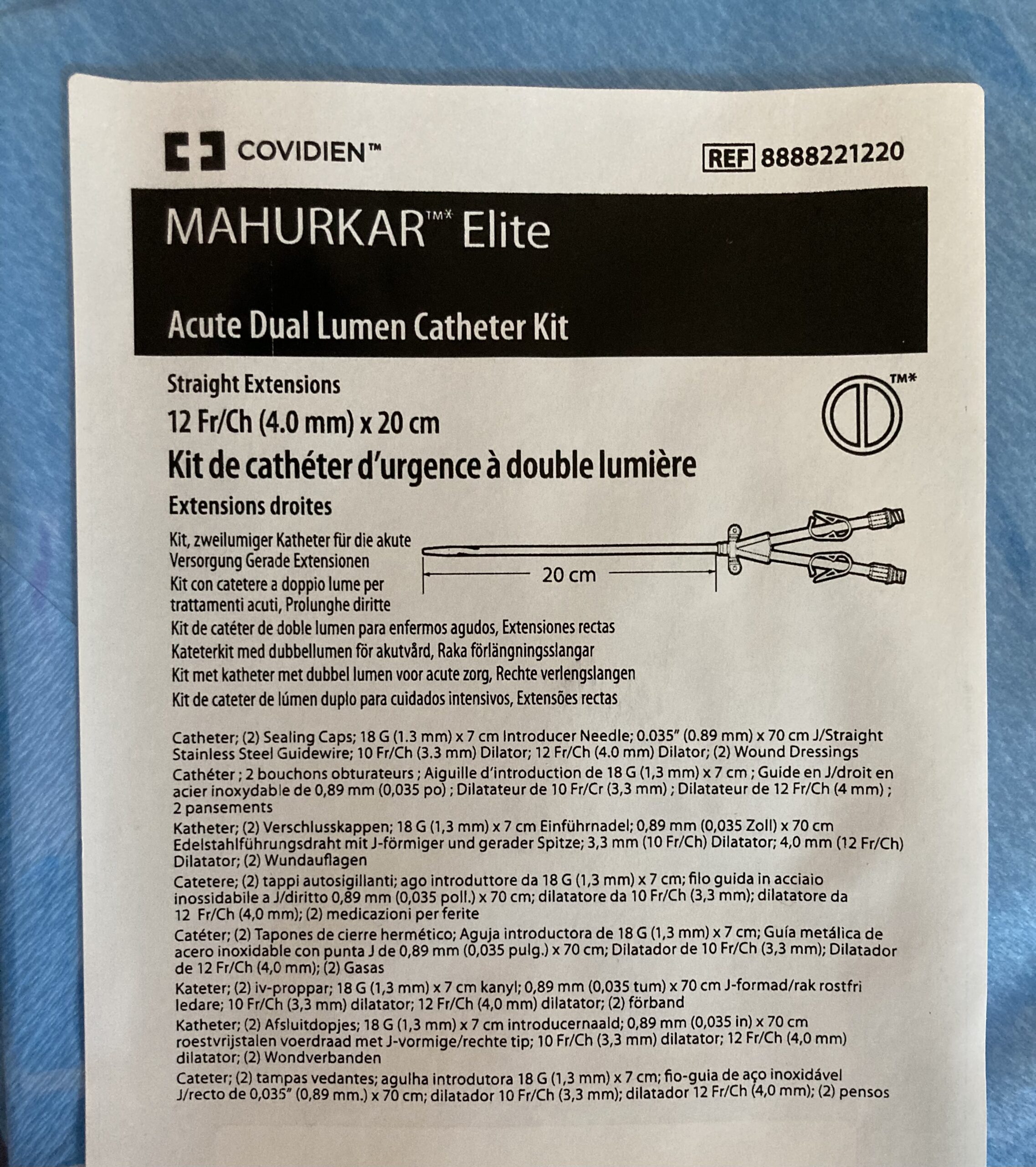 Nombre: Kit catéter Mahurkar Doble Lumen 12 Fr. X 20 cm. extensiones rectas